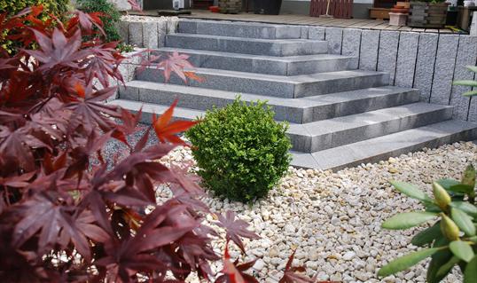 So konnte die Stufenanlage auch gestalterisch mit eingebunden werden und bildet durch den vor Ort erfolgten Gehrungsschnitt das Bindeglied zum Garten.
