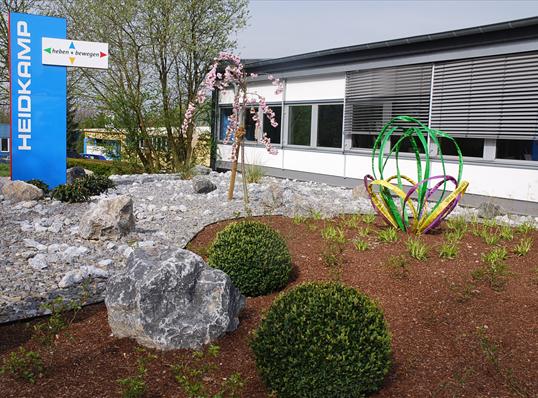 Wir finden, dass hier eine schöne Kombination aus Gartengestaltung und der repräsentativen Darstellung der Produktpalette der Firma gelungen ist.