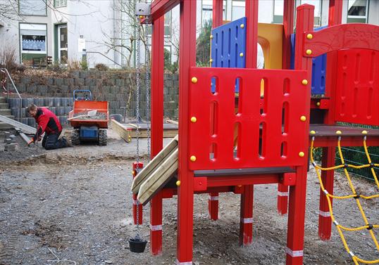 Espas, wie z.B. der auf dem Foto zu sehende Rutschturm und ein Sandkasten wurden montiert und lassen Kinderherzen höherschlagen. Großzügig angelegte Fallschutzflächen sorgen für die nötige Sicherheit.