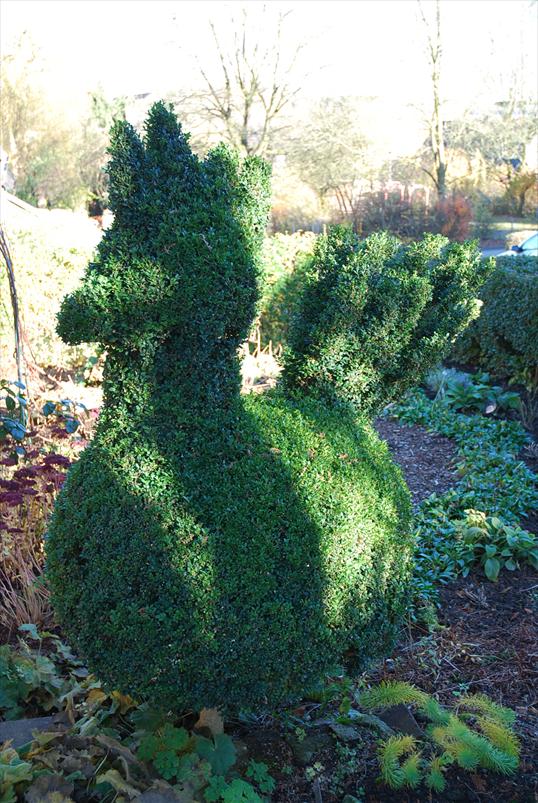 Ein besonders großes und schönes Exemplar steht hier in Wuppertal. Mit viel Mühe, Fleiß und entsprechendem Blick wurde hier ein Huhn als Formschnitt aus einem Buchsbaum herausgeschnitten.