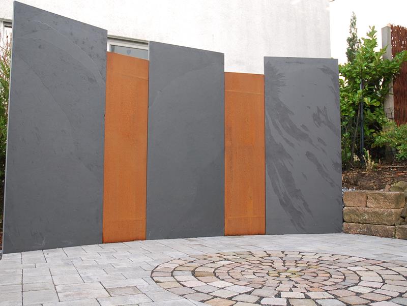 Der individuelle Sichtschutz aus Cortenstahl in Kombination mit Schieferstelen umrahmt