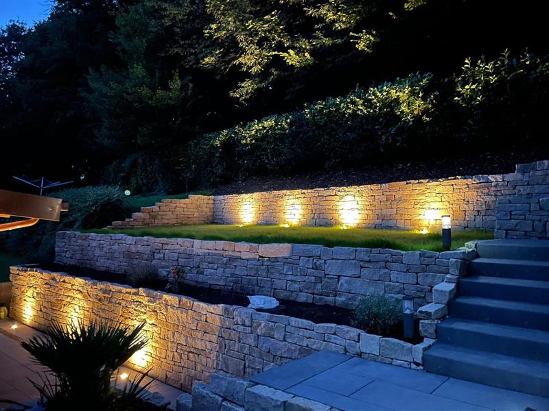 Die Illumination einer Trockenmauer in Velbert-LangenbergDie Illumination der Trockenmauer aus dem vorigen Bericht bringt in den Abendstunden Atmosphäre in den Garten.