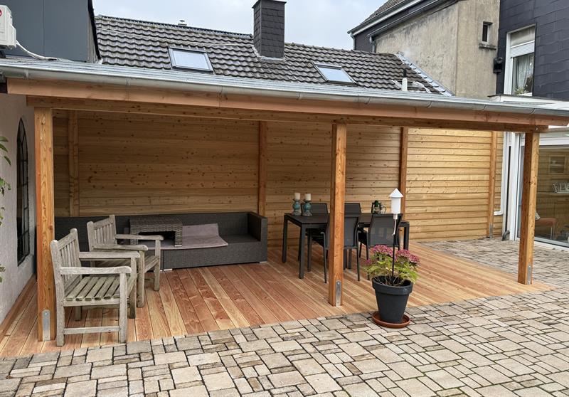 Zu der bereites vorhandenen frei liegenden Terrasse ist jetzt ein überdachter Sitzbereich entstanden, der auch bei etwas schlechterem Wetter zum Verweilen einläd.