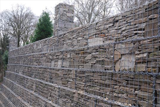 Hier im Bergischen Land, im Dreieck Velbert,,Hattingen, Wuppertal, entstand eine Gabionenwand, die an der Sichtfläche mit anstehendem Ruhrsandstein befüllt wurde.