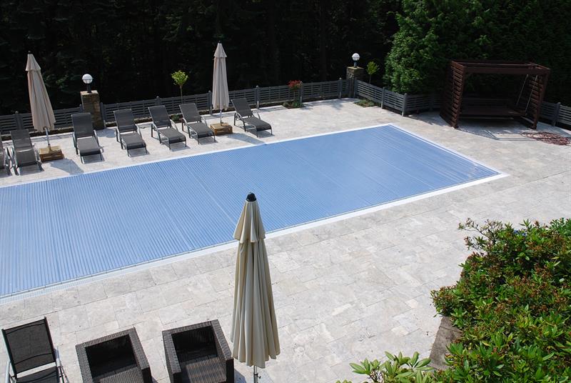 Ein echter Hingucker ist diese großzügige Terrasse aus Travertin-Naturstein.