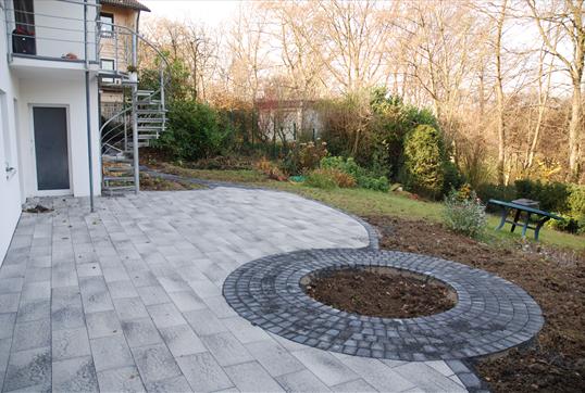 Die ca. 4o qm große Terrasse wurde durch einen Kreis aus Terra Toscana Pflaster aufgelockert, in dessen Mitte der Hausbaum gepflanzt werden soll, der im Sommer ein guter Schattenspender sein wird.