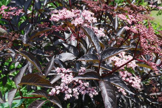 Die hier auf dem Foto zu sehende Sorte (Sambucus nigra "Black Beauty") hat ein sehr dunkelrotes Laub und kann als Kontrast oder echter Hingucker in jeder Staudenrabatte dienen.