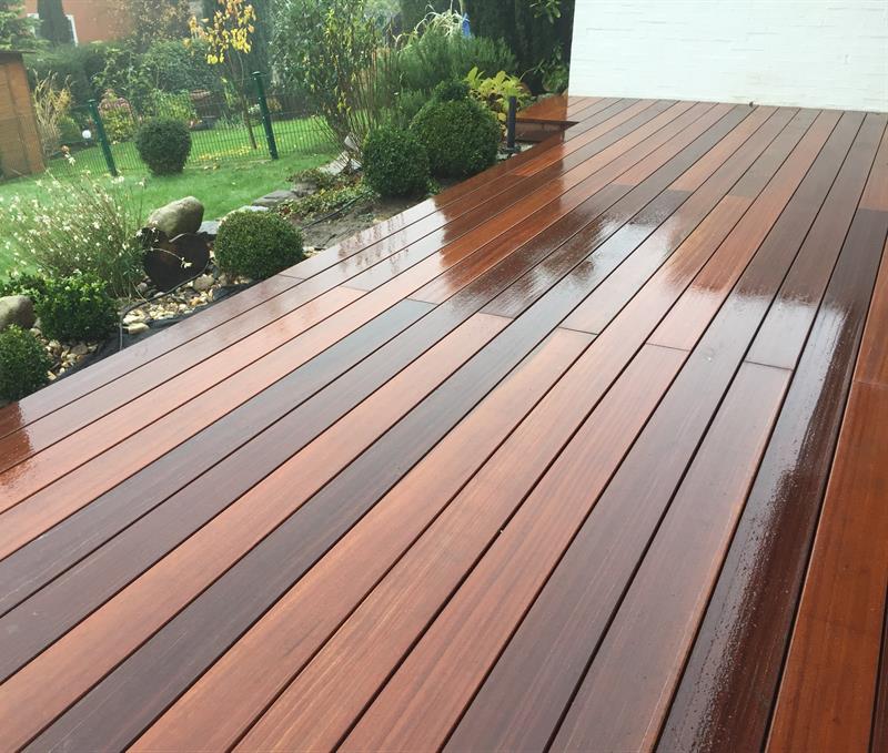 Die hier auf dem Foto zu sehende Holzterrasse wurde aus Bankirai-Bodendielen mit glatter Oberfläche verlegt.