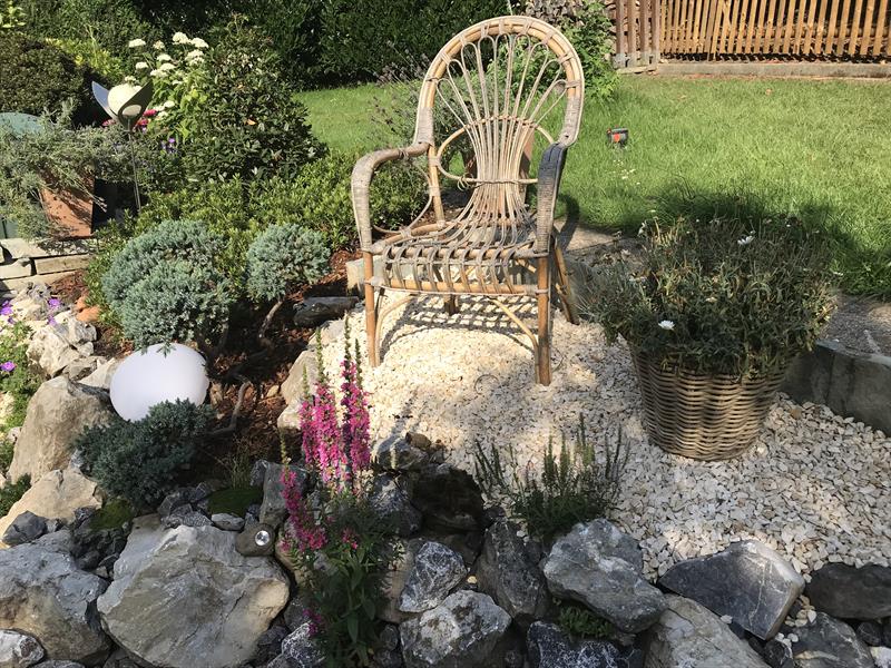 Eingebettet in die Gesamtgestaltung dieses Gartenteils macht der kleine Sitzplatz aber auch ohne "Besuch" eine gute Figur und fügt sich sehr gut ins Gesamtbild ein.