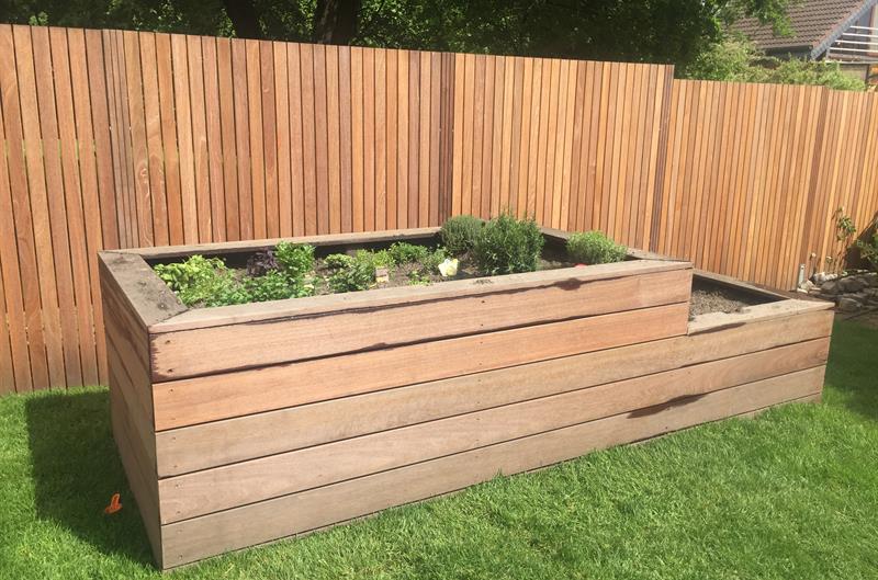 In voller Sonne steht dieses Hochbeet in Ratingen. Dauerhafte Bangkirai-Dielen sorgen für eine lange Haltbarkeit.