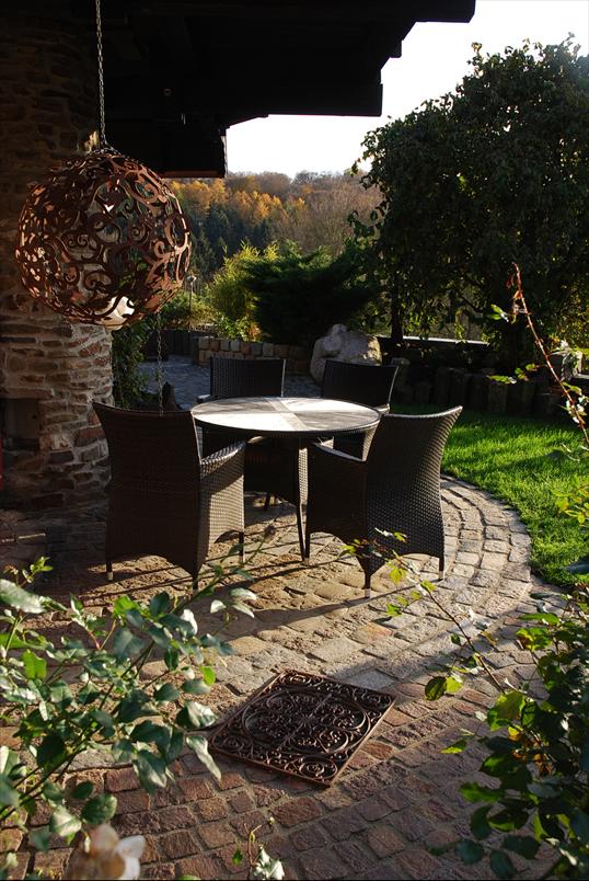 Aus vorhandenem Grauwacke- und Porphyrpflaster entstand dieser lauschige Sitzplatz in Velbert.