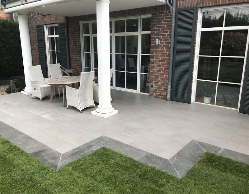 In Mettmann bauten wir im Herbst 2018 diese pflegeleichte Terrasse aus Keramikplatten und Natursteinstufen.
