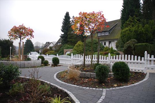 Immergrüne Pflanzen wie Buchsbaum, Schneeball oder verschiedene Gräser stehen zwischen den beiden Amberbäumen, bodendeckenden Rosen und verschiedenen Stauden und bieten so dem Betrachter zu jeder Zeit ein interssantes Bild des Vorgartens.