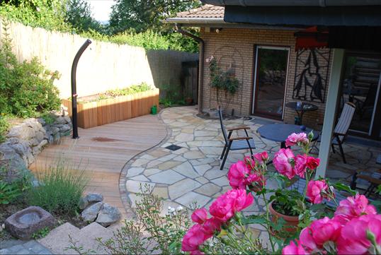 Ausgewählt wurde eine Verlegung aus Polygonalplatten, um ohne einen Zuschnitt die Rundungen der Terrasse zu betonen.