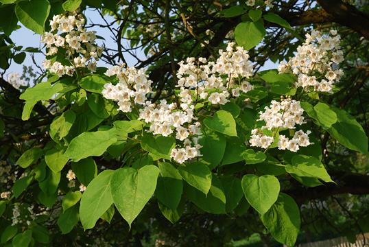 Trompetenbaum (Beamtenbaum) Catalpla bignonioides Pflanze des Monats 8/2013Detailfoto der Blüten am Trompetenbaum (Catalpa bignonioides).